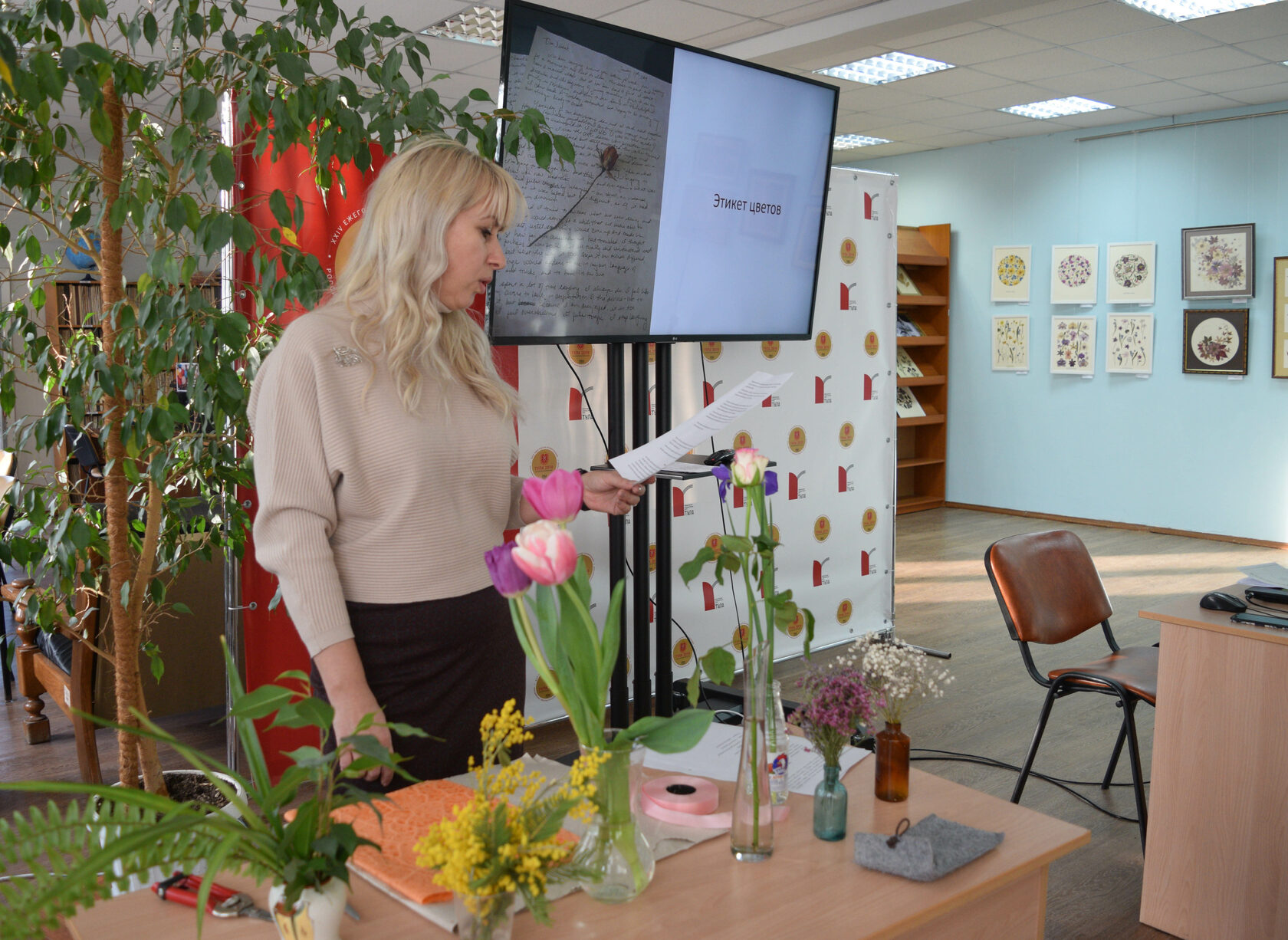 В Тульской научной библиотеке 5 и 6 марта прошел увлекательный флористический уикэнд, на котором можно было познакомиться с работами членов Союза МФЖиГ, представленными на выставке "Где-то там живёт мой цветок...", и прослушать цикл лекций и мастер-классов, показывающих разнообразие цветочного мира. Сама выставка продлится до 13 апреля.