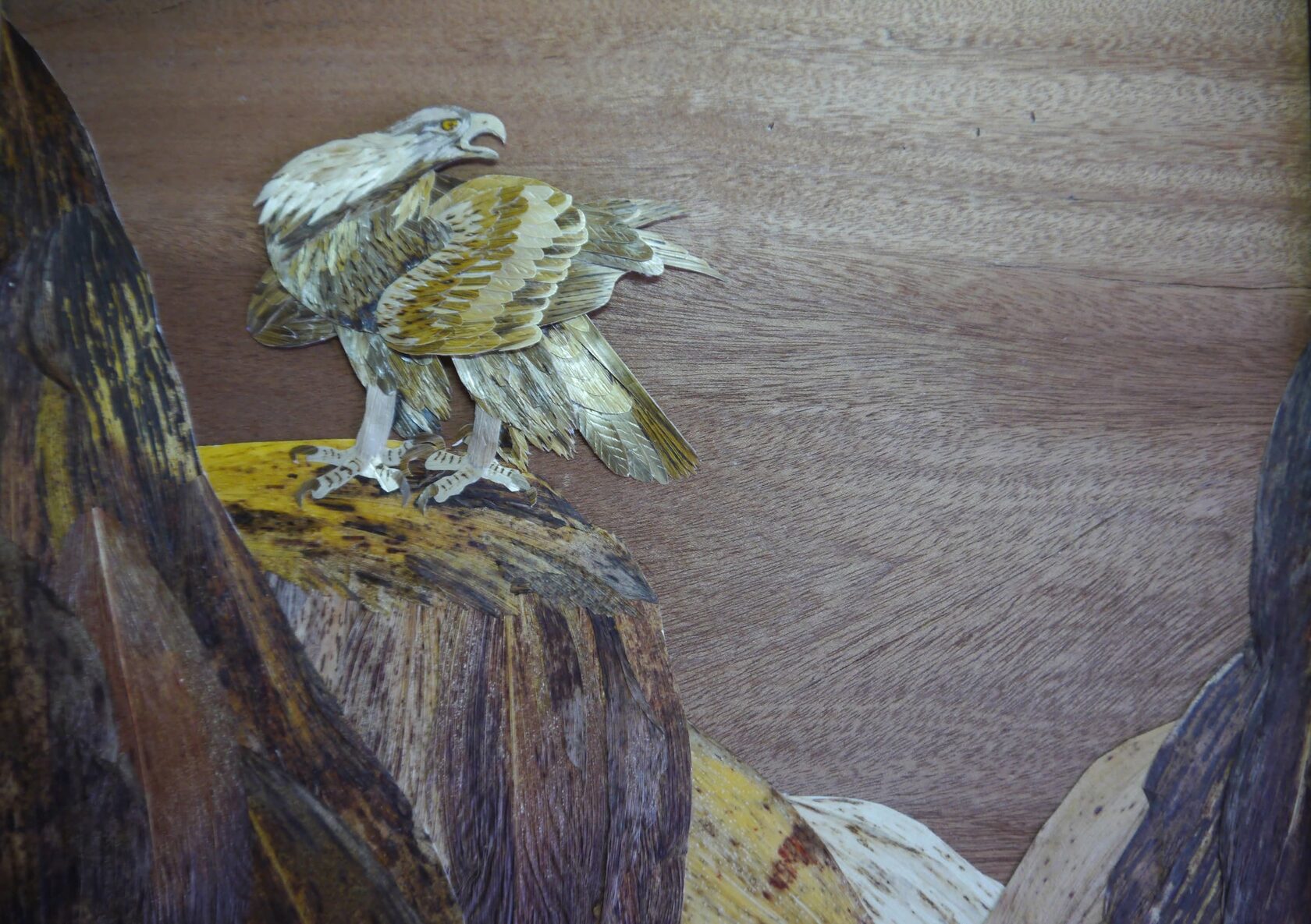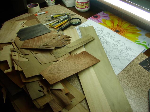 В отличие от обычных работ из природного материала, они собираются в единое изображение из множества деталей, четко подогнанных друг к другу, как пазлы. Для того, чтобы работать в этой технике, необходимы определенные инструменты и материалы: